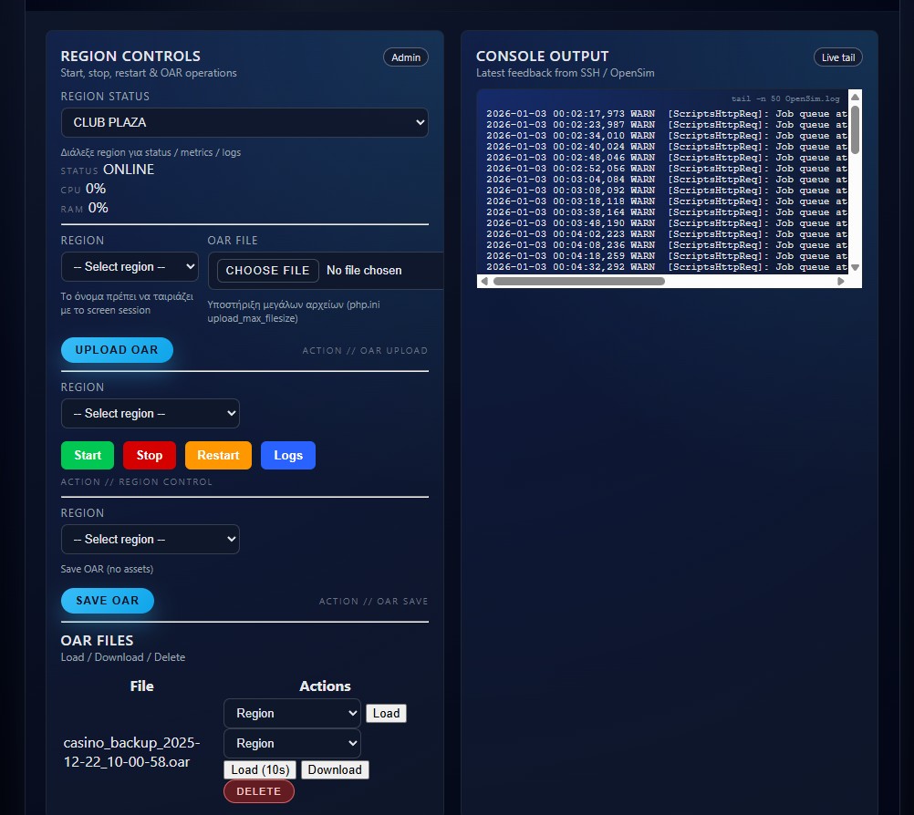 🧭 GBG HOSTING gives you full, streamlined control over your regions: 🔹 Start • Stop • Restart 🔹 OAR Save • OAR Load • OAR Upload • OAR Download 🔹 Complete region information 🔹 Advanced tools for effortless member management
